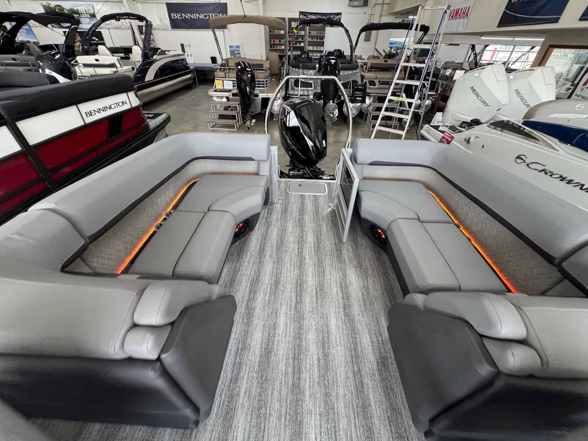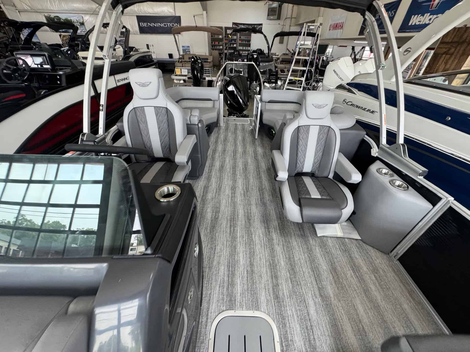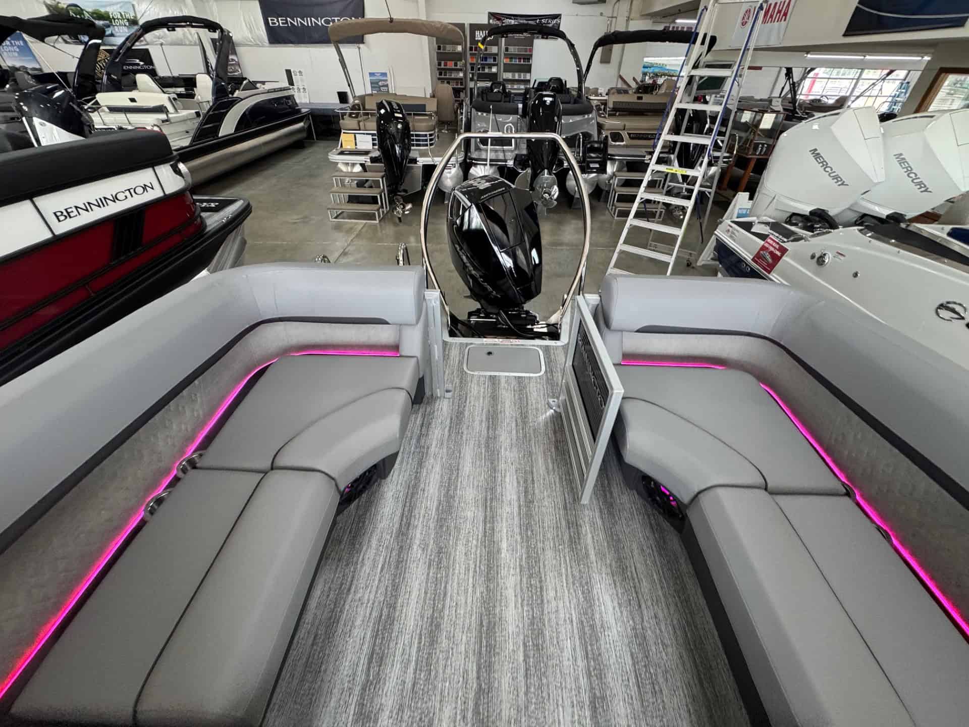 Experience the thrill of water adventure with the 2026 Bennington 24 MFB! Docked at Hall's Sport Center in Muskegon, this boat is the epitome of luxury and performance. Powered by a 200HP Mercury engine upgrade, it comes equipped with Mercury power steering and a Merc Mech pre-rig for effortless maneuvering. The Rockford Fosgate M1 lighted speakers set the mood for your journey, while the elevated console Mythos and RGB control offer a modern touch. Lumbar lighting and an electric power curved Bimini top elevate your comfort levels. The boat also includes a ski tow bar and in-floor and anchor storage for extra convenience. The SPS performance package, which includes a 33-gal fuel tank and a dual power distribution panel, ensures a thrilling ride. The smooth metallic silver accent panel adds a touch of elegance, making this boat a true showstopper.
