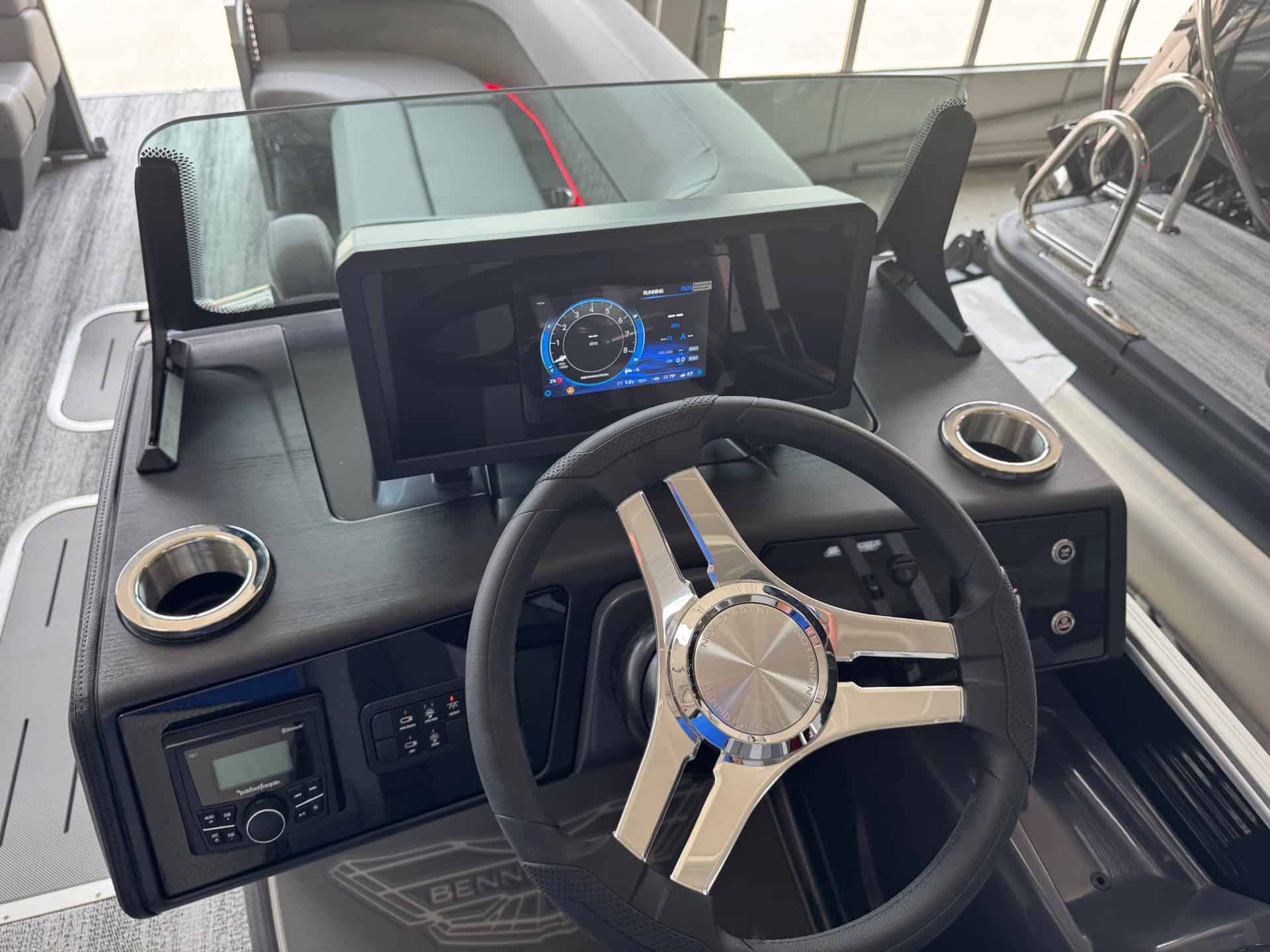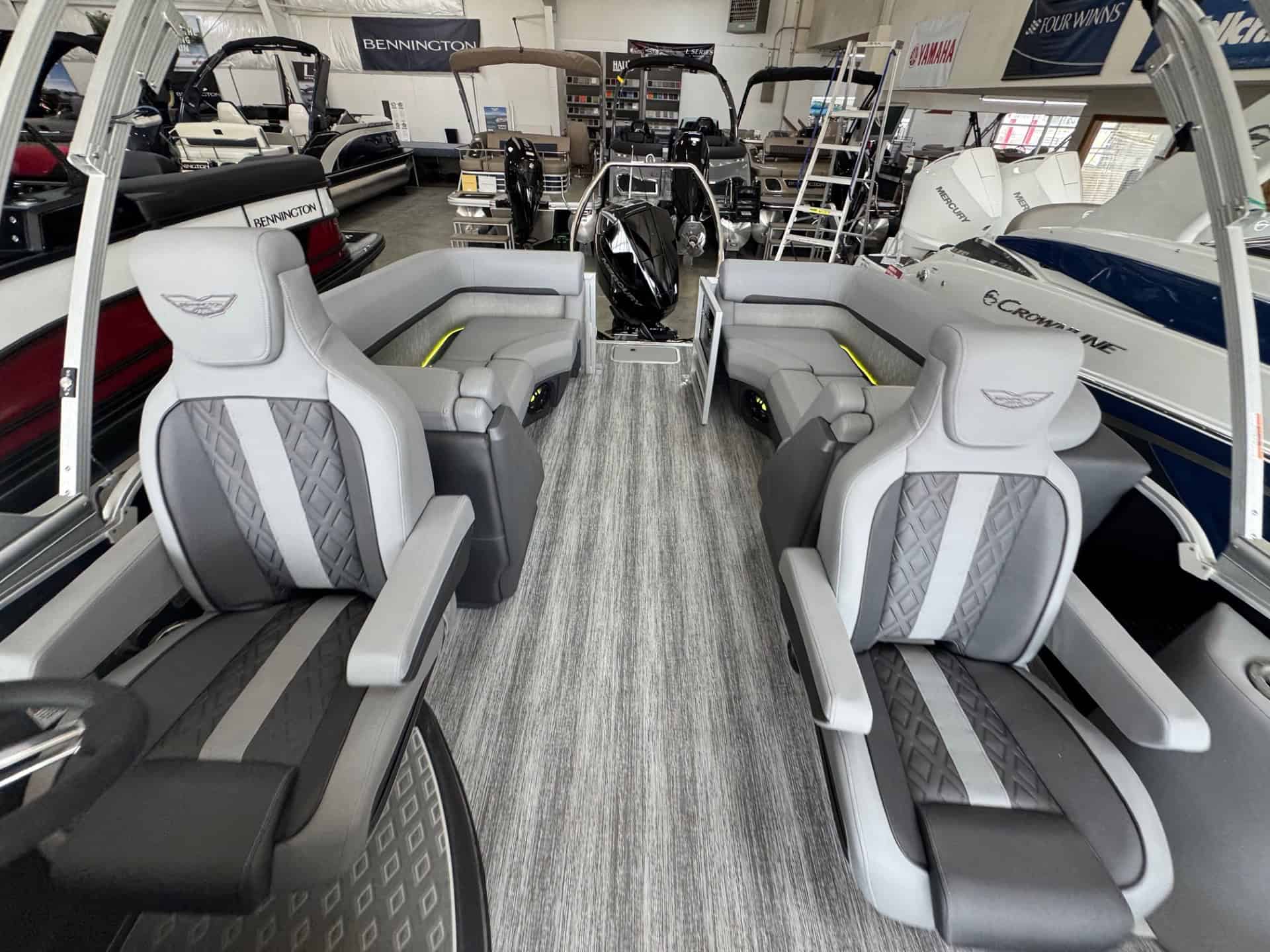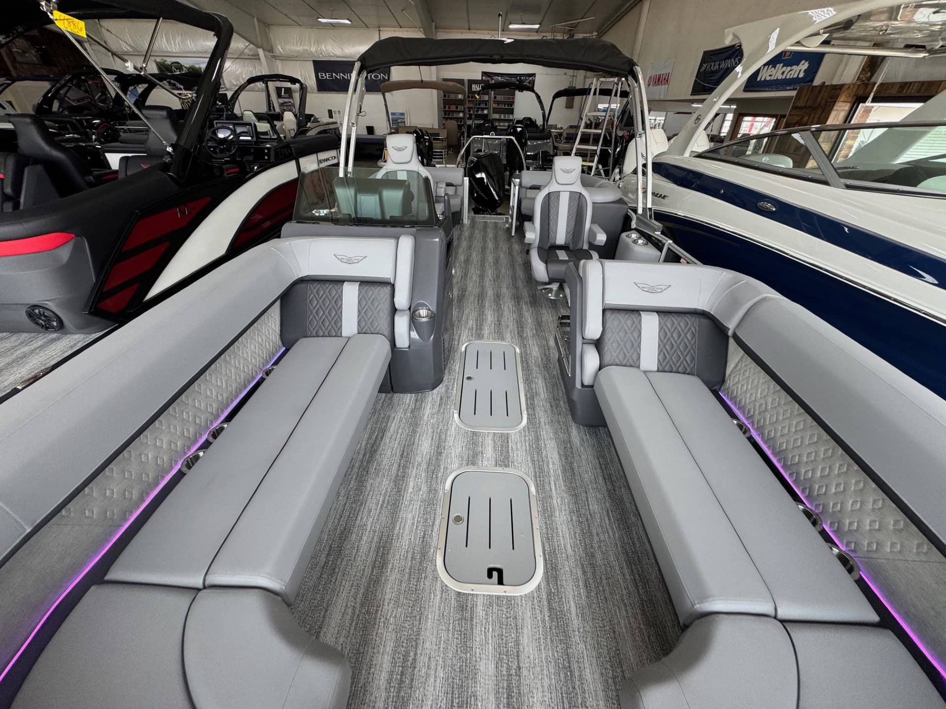 Experience the thrill of water adventure with the 2026 Bennington 24 MFB! Docked at Hall's Sport Center in Muskegon, this boat is the epitome of luxury and performance. Powered by a 200HP Mercury engine upgrade, it comes equipped with Mercury power steering and a Merc Mech pre-rig for effortless maneuvering. The Rockford Fosgate M1 lighted speakers set the mood for your journey, while the elevated console Mythos and RGB control offer a modern touch. Lumbar lighting and an electric power curved Bimini top elevate your comfort levels. The boat also includes a ski tow bar and in-floor and anchor storage for extra convenience. The SPS performance package, which includes a 33-gal fuel tank and a dual power distribution panel, ensures a thrilling ride. The smooth metallic silver accent panel adds a touch of elegance, making this boat a true showstopper.
